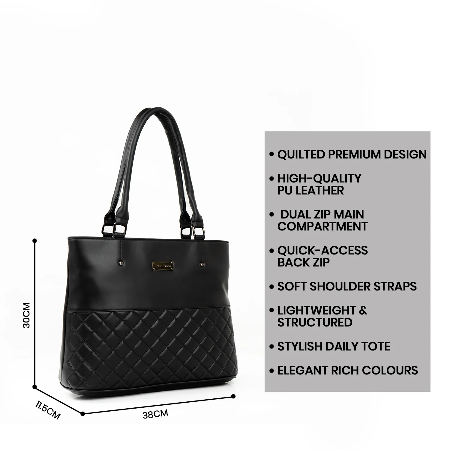 Crafted from premium PU leather, the tote maintains a sleek and polished silhouette while offering durability for daily use. Its spacious interior (approx. 38 cm width, 30 cm height, 11.5 cm depth) allows you to carry work essentials, documents, cosmetics, and personal accessories with ease. The secure top zip closure ensures everything stays protected.
